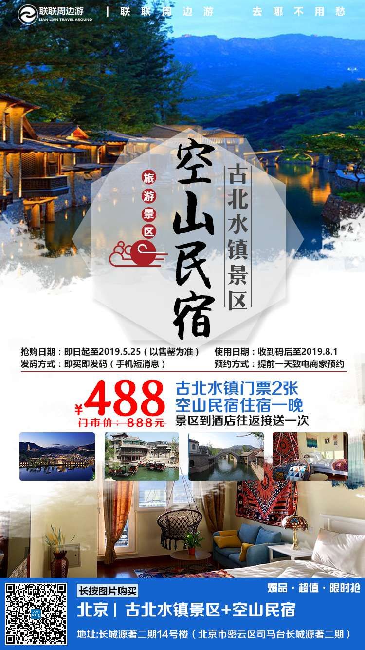 ▣ 古水北镇空山名宿景区门票+住宿特惠 抢购价: 488元 抢购日期:即日起 – 2019.5.25(以售罄为准) 发码日期:即买即发码(手机短消息) 预约日期:至少提前1天致电商家预约 使用日期:预约成功后 -2019.8.1